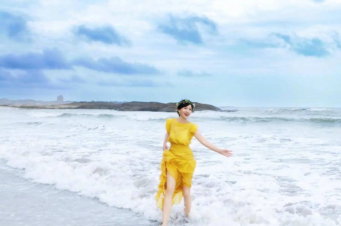站在海边的她,舒适的吹着海风,在海边光脚踏浪行走,随意的状态反倒让她显得更加优雅和更有气质。