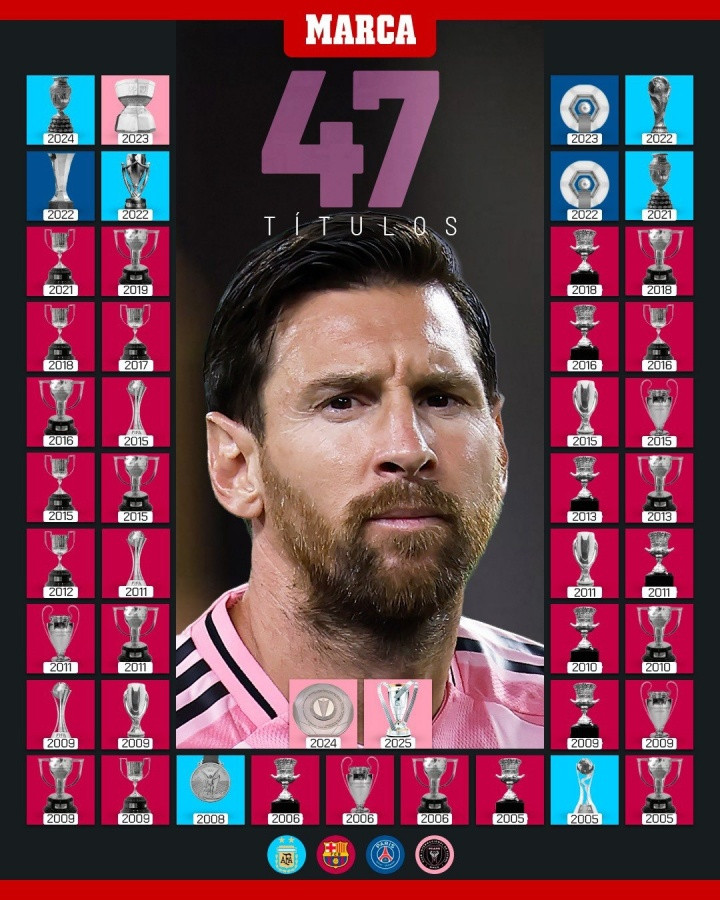 梅西已经在近二十年的职业生涯中收获了47个冠军,他的目标是拿到50个冠军之后再退役。参考阿根廷国家队和迈阿密国际的状态,梅西大概率可以实现这个目标,以完美的姿态结束球员生涯。