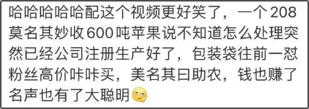 有网友表示以为赵露思是在做公益,但没想到是在做生意。收了果子卖不出去,就新开一家公司做果干果汁,最后再利用明星效应带货,一来二去,助农也助过了,钱也赚了,名声也有了,只有网友是被忽悠的。