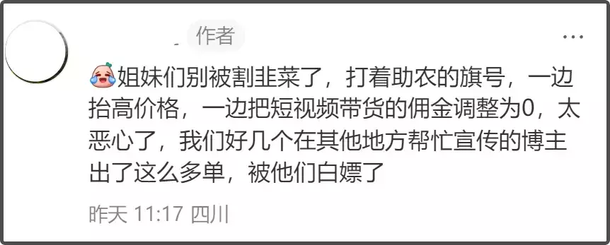 甚至网友爆料这个品牌打着助农的旗号抬高价格还不给带货佣金,这是有了赵露思站台,就不需要其他人助力了?