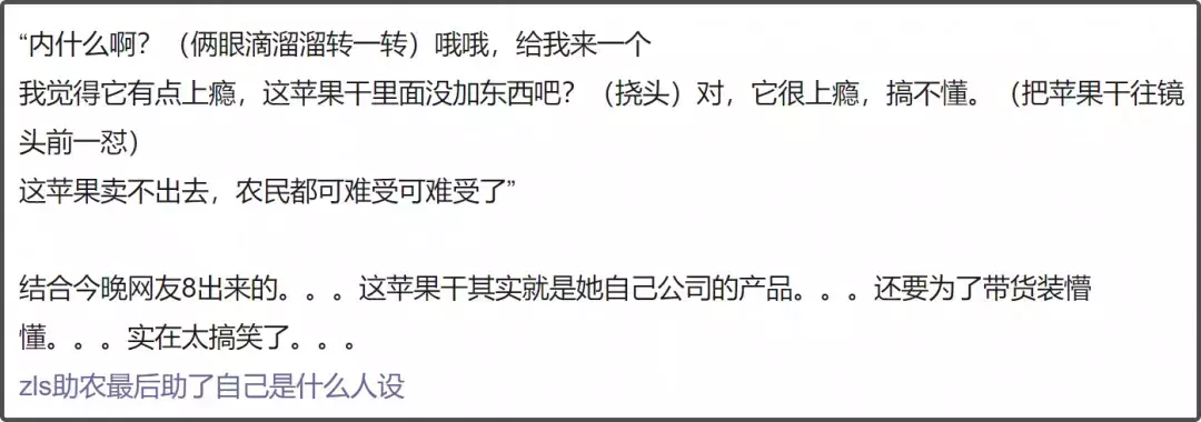 但后来又发展了助农赛道,开始推销苹果干,说是助农产品,一边说自己不推荐品牌,一边又超绝不经意露出包装,引得网友激情下单购买。