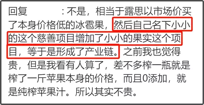 赵露思此前在直播中说收了600吨冰雹果卖不出去,最后才以这种果汁果干的形式进行销售。但是网友表示定价很贵,说是助农,但本身也赚钱了,顺便还能挤占市场,打响品牌,赵露思也落得美名,整个过程形成闭环。