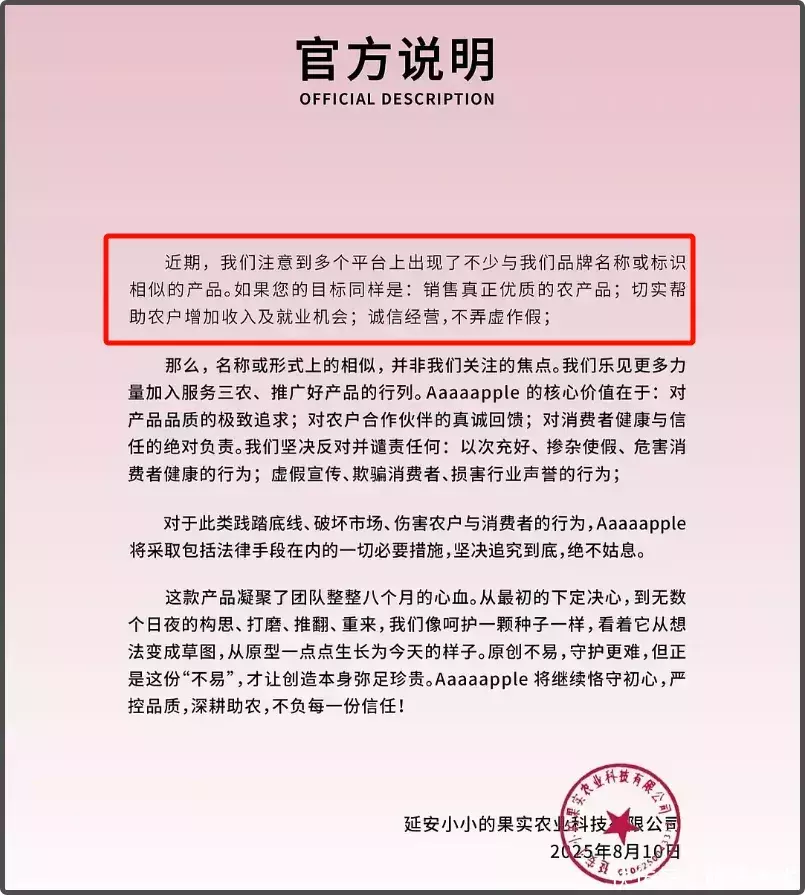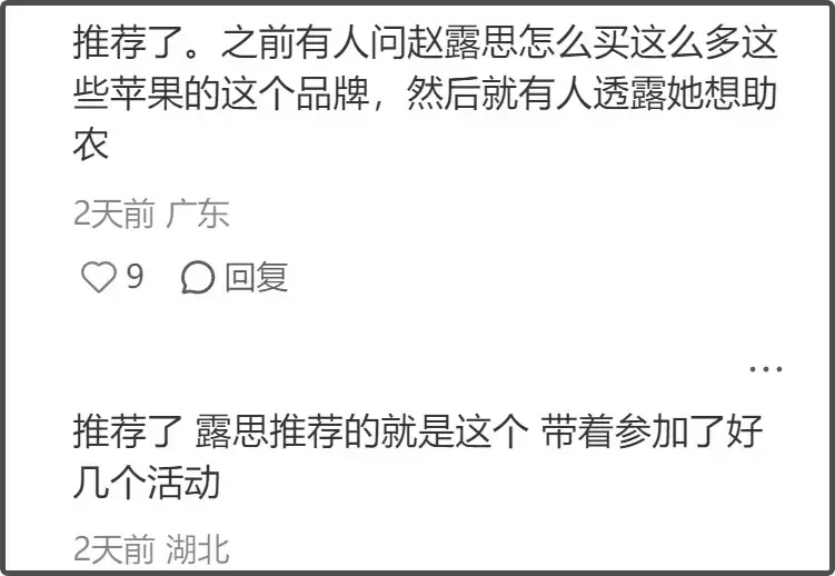 这一套关系链引起网友注意,如果这么算的话,网友买助农产品,还助了赵露思?毕竟助农苹果干的品牌有很多,网友都去买这家,都是源自于赵露思的明星效应。这个品牌还曾发声明打击盗版,呼吁网友认准官方。